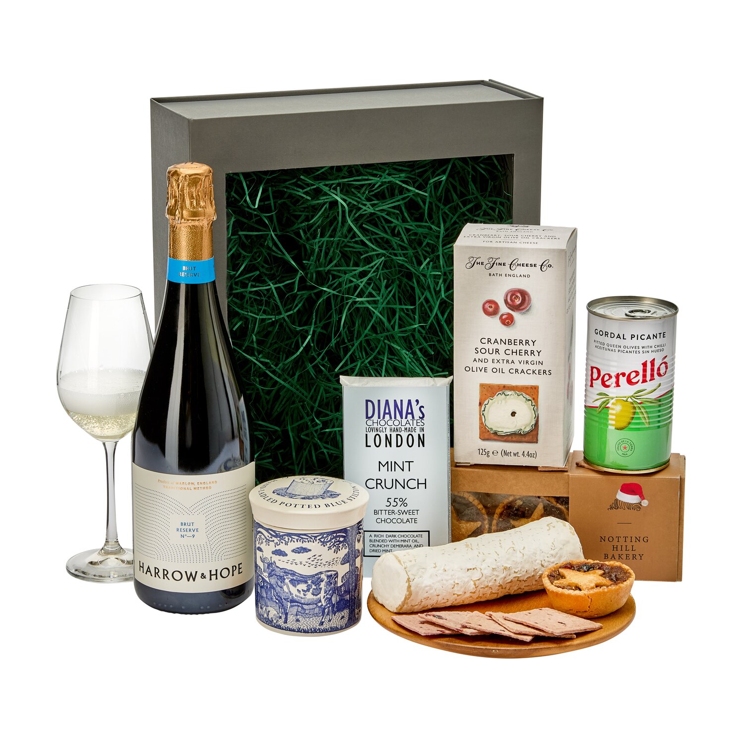 Includes: N.V. Brut Reserve No 9, Harrow & Hope, Ragstone cheese, Notting Hill Mince Pies, The Fine Cheese Co Cranberry & Sour Cherry Wafers, Ballancourt Phesant paté, Diana's Mint Crunch Chocolate Bar